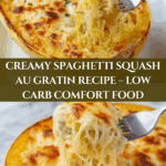 Spaghetti Squash Au Gratin is a delicious and healthy twist on a classic comfort food favorite. Creamy cheese sauce combines with tender roasted spaghetti squash for a satisfying dish that’s perfect as a main or side. It’s a great way to enjoy cheesy goodness with fewer carbs.