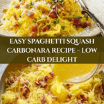 A creamy, comforting Spaghetti Squash Carbonara recipe featuring roasted spaghetti squash tossed with crispy bacon, garlic, and a rich egg and Parmesan sauce. This low-carb twist on traditional carbonara is perfect for a satisfying and flavorful meal.