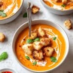Keywords: spicy tomato soup, Calabrian chilies, roasted red pepper soup, creamy tomato soup, homemade croutons, Italian soup