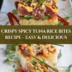 This Spicy Tuna Crispy Rice recipe features perfectly cooked sushi rice that’s chilled, pressed, and then pan-fried until golden and crispy. Topped with a spicy tuna mixture made with sashimi-grade tuna, mayonnaise, sriracha, and soy sauce, and garnished with avocado slices, sesame seeds, and green onions, this dish is a delightful fusion of textures and bold flavors, perfect as an appetizer or a light meal.