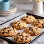 The image shows six large, round chocolate chip cookies on a baking tray lined with parchment paper. Each cookie has a light golden-brown color with rough, bumpy texture and dark brown chocolate chips unevenly scattered on top and inside. The tray is rectangular with a black edge and placed on a white marbled surface. In the background, there is a white stack of plates, a blue cup, and a white vase with white flowers that have yellow centers. The focus is clearly on the cookies, making them look fresh and soft. photo taken with an iphone --ar 4:5 --v 7