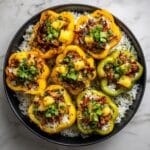 - Serve: Let the stuffed peppers cool slightly after baking. Optionally, garnish with extra pineapple pieces or sliced green onions before serving for added freshness and flavor.