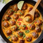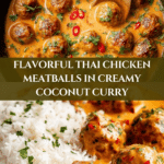 These Thai Chicken Meatballs in Coconut Curry combine tender baked chicken meatballs with a fragrant, creamy coconut curry sauce. Infused with fresh herbs, red curry paste, and balanced with lime and brown sugar, this dish is a flavorful and comforting meal served over jasmine rice.
