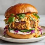 These Thai Peanut Turkey Burgers combine lean ground turkey with fresh herbs and spices, grilled to juicy perfection and topped with a creamy, tangy peanut sauce. Enhanced with crisp vegetables and served on toasted buns, these burgers offer a delicious fusion of savory and slightly sweet flavors inspired by Thai cuisine.