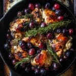The image shows a black cast iron pan filled with browned chicken pieces that have crispy skin, ranging from light golden to dark brown shades. The chicken is arranged in a slightly overlapping way, covering most of the pan's surface. Scattered around and on top of the chicken are small dark blue and red berries that look juicy and slightly cooked. Sprigs of fresh green rosemary are placed among the chicken and berries, adding texture and color contrast. The pan sits on a rustic baking tray with a rough, worn surface, but the entire scene is viewed against a white marbled texture. Photo taken with an iphone --ar 4:5 --v 7