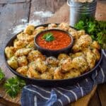 7. Garnish and Serve: Once baked, arrange the tortellini on a serving tray. Drizzle with melted butter and sprinkle with extra Parmesan, chili flakes, and minced Italian parsley for a festive touch. Serve immediately alongside a bowl of warm marinara sauce for dipping and enjoy your party-ready appetizer!