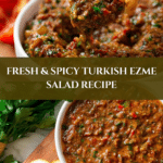 Turkish Ezme is a vibrant, fresh mezze salad made with finely chopped tomatoes, onions, and bell peppers, seasoned with a blend of zesty spices, lemon juice, and olive oil. This no-cook recipe is perfect as a tangy accompaniment to grilled meats, a refreshing dip, or a flavorful salad, offering a delicious taste of traditional Turkish cuisine.