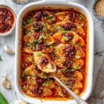 This Viral Trader Joe’s Dumpling Bake is a flavorful, comforting dish featuring crispy potstickers baked in a creamy Thai-style red curry sauce. Topped with fresh cilantro, green onions, and a spoonful of crunchy chili crisp, it’s an easy and delicious meal that’s perfect for a quick dinner or entertaining guests.