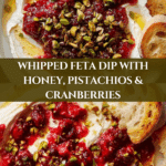 This whipped feta dip with honey, pistachios, and cranberries is a delightful blend of creamy, tangy, and sweet flavors. It’s quick to prepare and makes a perfect appetizer or snack to share with friends and family.