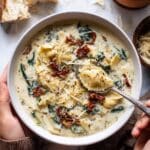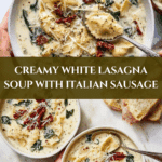 A creamy and hearty White Lasagna Soup that combines savory Italian sausage, tender lasagna noodles, and a blend of ricotta, mozzarella, and Parmesan cheeses in a flavorful chicken broth with white beans and spinach. This soup offers all the comforting flavors of traditional lasagna in a warm, easy-to-make bowl.
