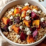 This Winter Harvest Dinner Bowl is a wholesome and hearty meal combining nutty barley, sweet roasted root vegetables, tangy feta cheese, and crunchy pumpkin seeds, all brought together with a drizzle of balsamic vinegar. Perfect for a cozy dinner during the colder months, this dish balances warmth, texture, and fresh flavors with simple preparation.